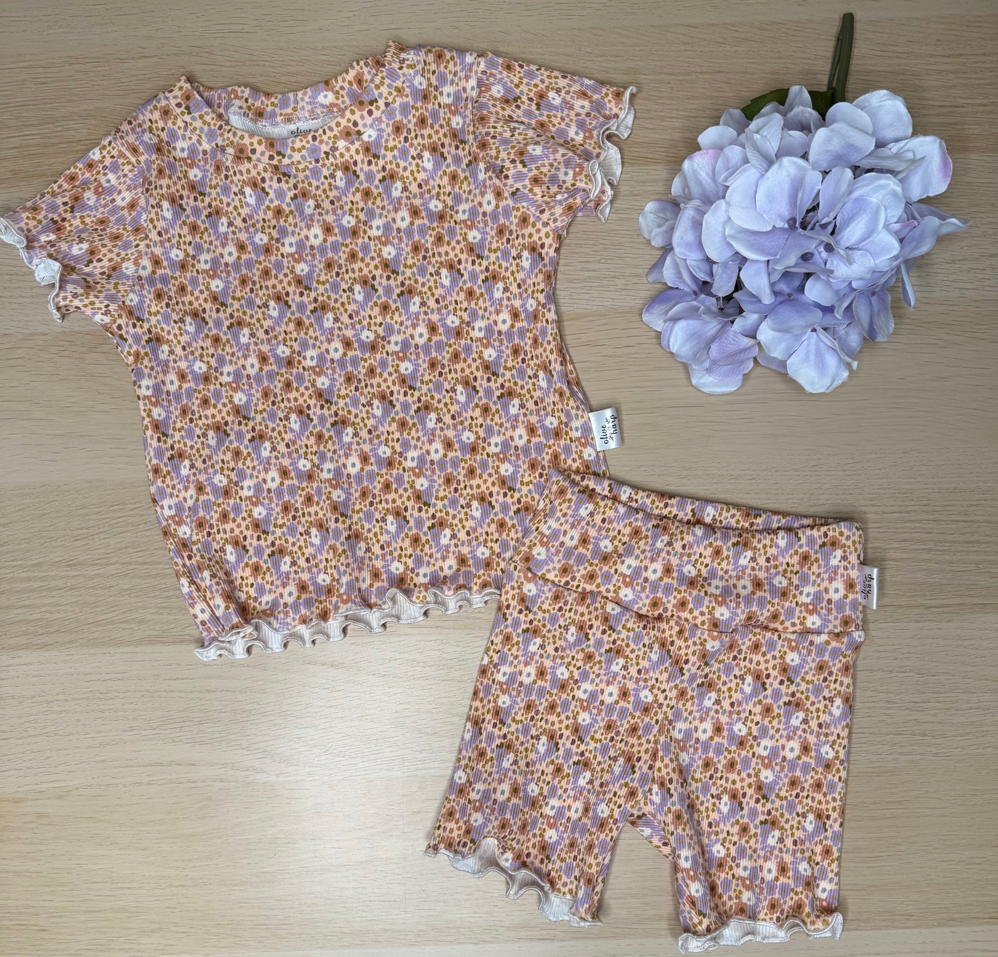 Our Bowie summer sets are made with super stretchy rib knit! They have an oversized fit tee with teeny bike shorts, both finished with a lettuce hem for an added flare!