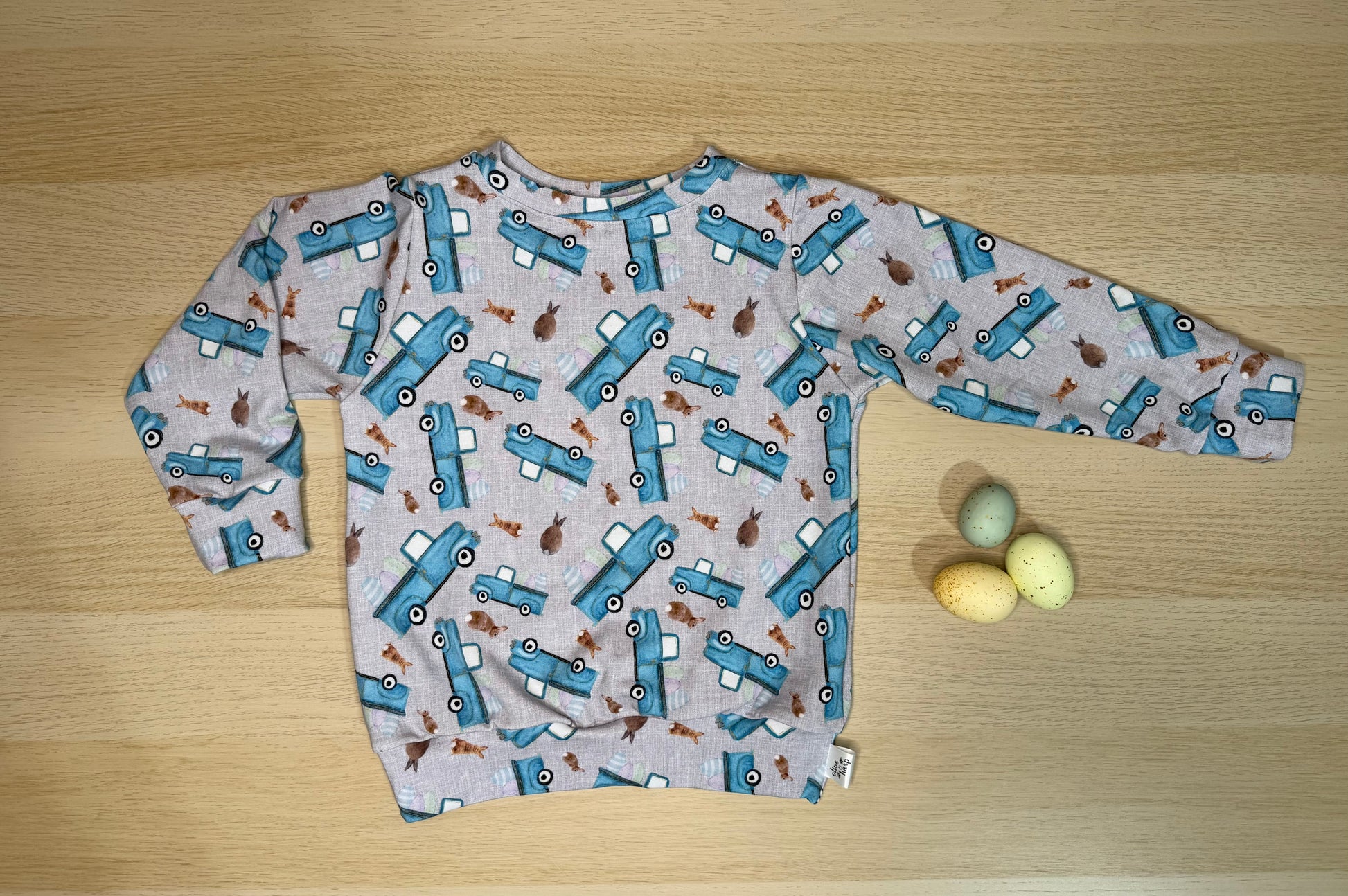 This little Easter truck crew is made with super soft french cotton! It fits true to size and is incredibly stretchy and cozy!